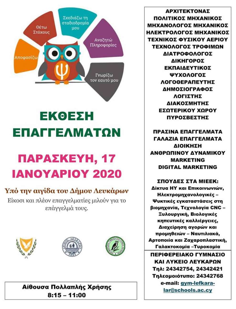 Η Έκθεση Επαγγελμάτων διοργανώνεται στην Αίθουσα Πολλαπλής Χρήσης του Περιφερειακού Γυμνασίου Λευκάρων, την Παρασκευή, 17 Ιανουαρίου 2020 στις 8:15 π.μ