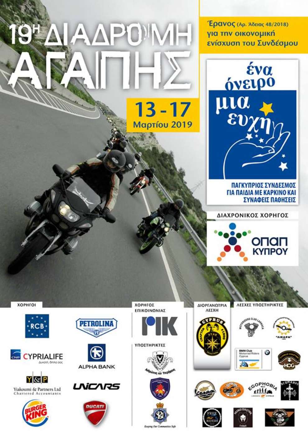 Φέτος πραγματοποιείται η 19η τετραήμερη διαδρομή αγάπης στις 13-17 Μαρτίου 2019, όπου οι μοτοσικλετιστές από το πρωί μέχρι το βράδυ, θα κάνουν τον γύρο της Κύπρου με μικρές στάσεις στις κοινότητες της κάθε πόλης για τη συλλογή χρημάτων.