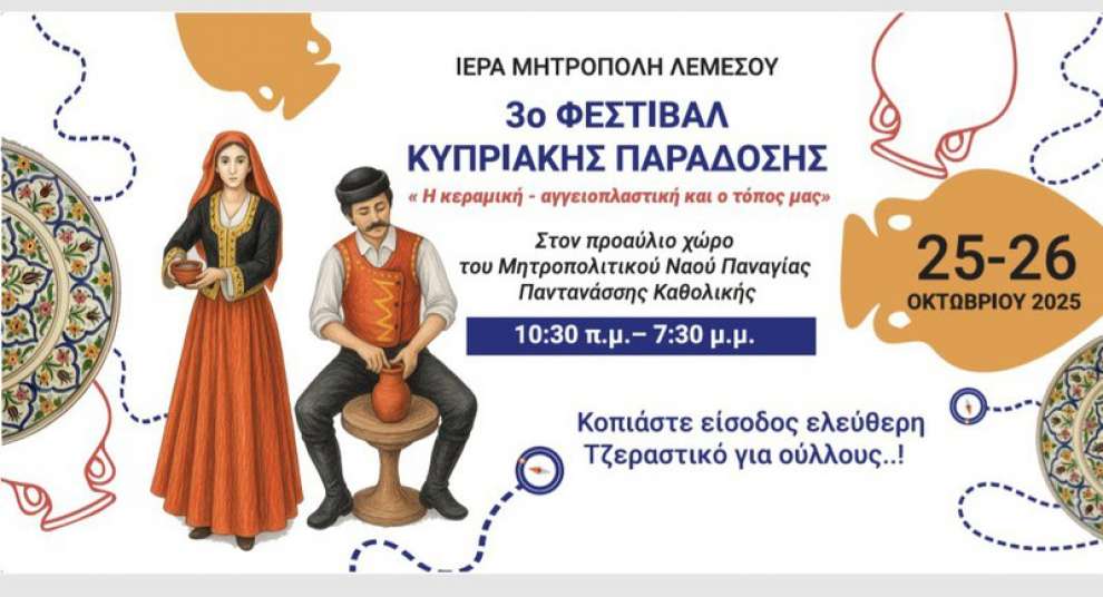 Η Ιερά Μητρόπολη Λεμεσού μάς καλεί σε ένα αυθεντικό ταξίδι στην κυπριακή ψυχή, το Σάββατο 25 και Κυριακή 26 Οκτωβρίου 2025, στον προαύλιο χώρο του Μητροπολιτικού Ναού Παναγίας Παντανάσσης Καθολικής.