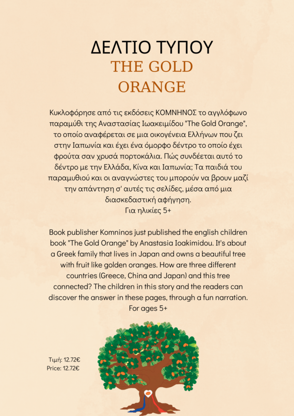 Τι συνδέει τις τρεις χώρες Ελλάδα, Κίνα και Ιαπωνία;  Η απάντηση την οποία μπορούν οι μικροί και οι μεγάλοι αναγνώστες να τη βρουν στις σελίδες του βιβλίου μετά από μία προσεχτική αλλά διασκεδαστική αναγνώστη εστιάζεται στο όμορφο δέντρο το οποίο έχει φορτωμένα πάνω του φρούτα που μοιάζουν σαν χρυσά πορτοκάλια.