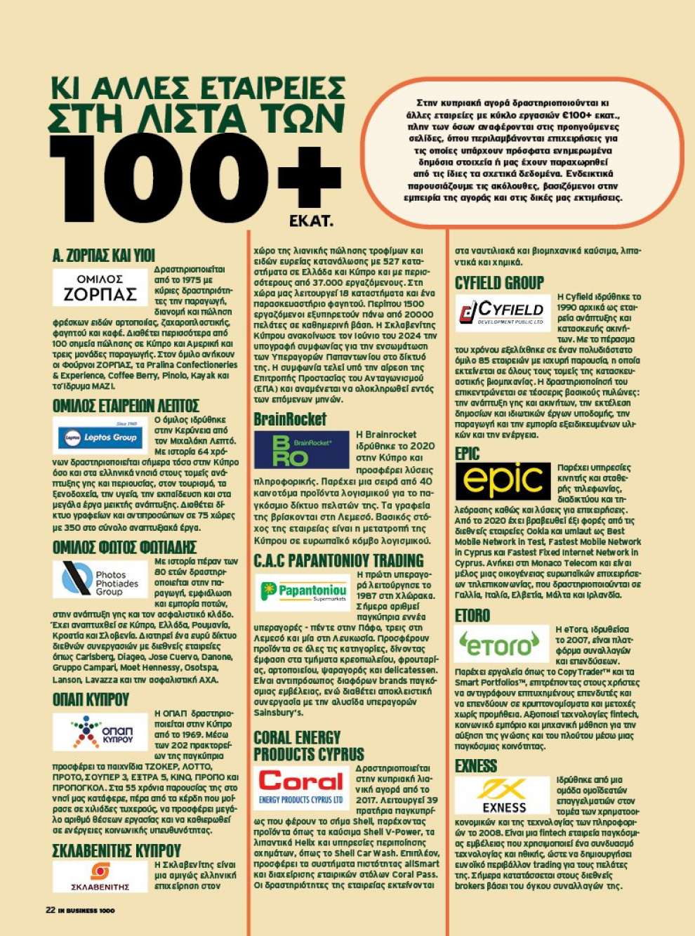 Στην κυπριακή αγορά δραστηριοποιούνται και άλλες εταιρείες με κύκλο εργασιών 100+ εκατ. ευρώ, πλην των όσων αναφέρονται πιο πάνω, όπου περιλαμβάνονται επιχειρήσεις για τις οποίες υπάρχουν πρόσφατα ενημερωμένα δημόσια στοιχεία ή μας έχουν παραχωρηθεί από τις ίδιες τα σχετικά δεδομένα. Ενδεικτικά παρουσιάζουμε τις ακόλουθες, βασιζόμενοι στην εμπειρία της αγοράς και στις δικές μας εκτιμήσεις.