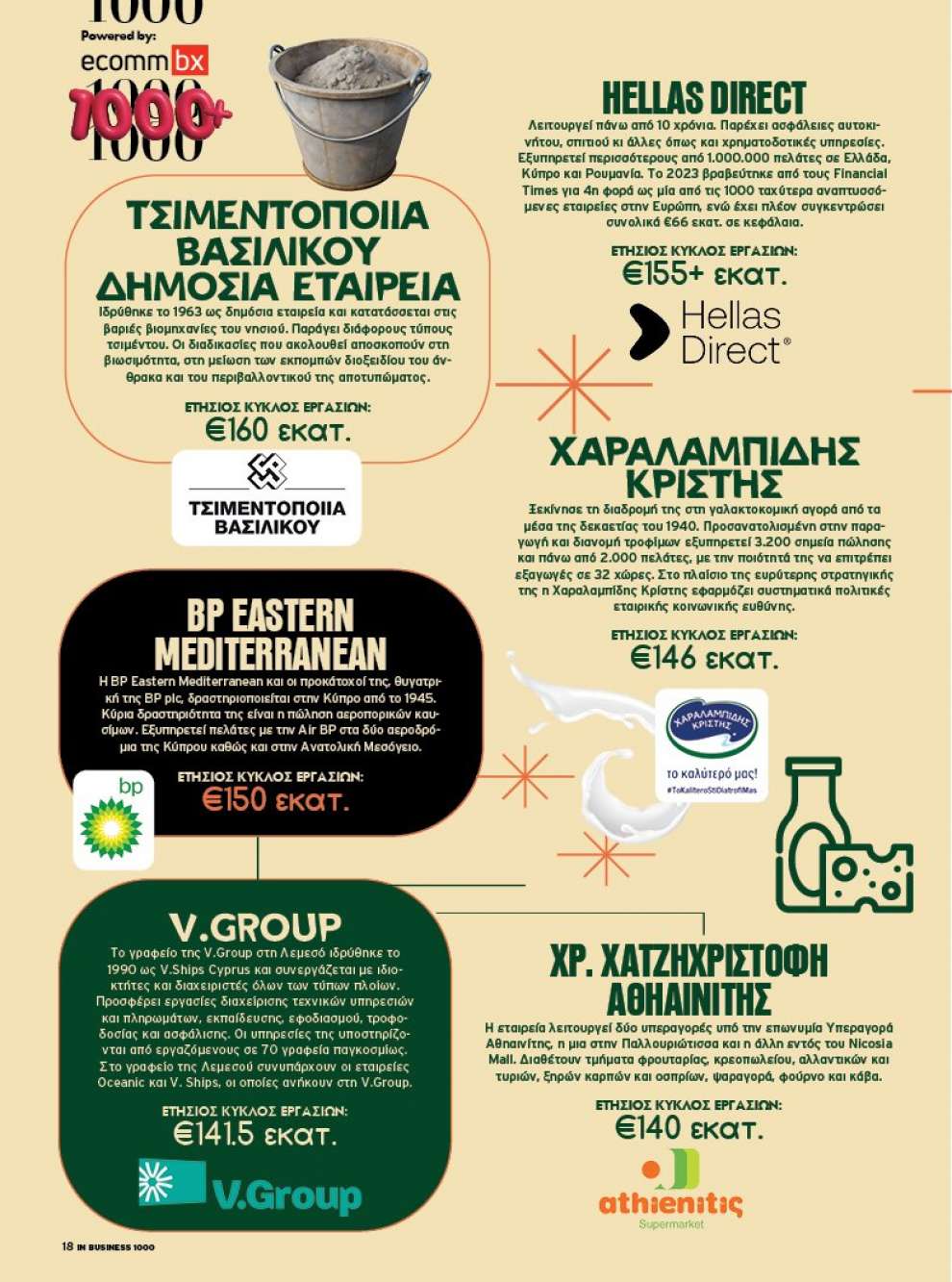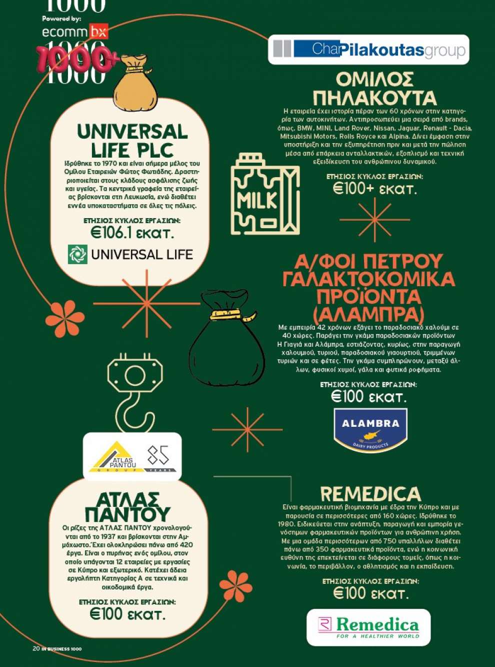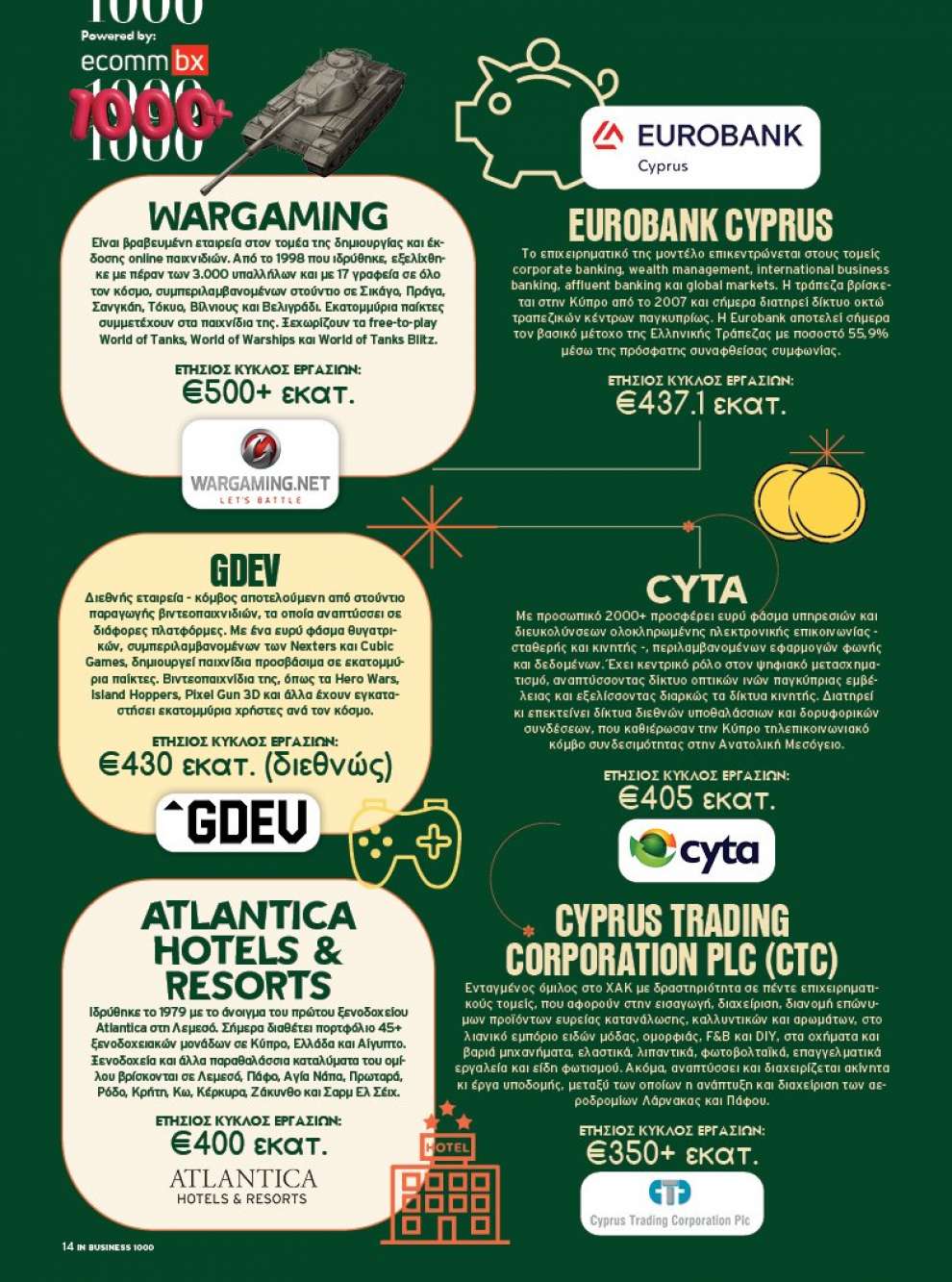 Στο θέμα που ακολουθεί, και το οποίο δημοσιεύεται στη συλλεκτική έκδοση Οκτωβρίου του περιοδικού IN Business με τις 1000+μεγαλύτερες εταιρείες της Κύπρου, περιλαμβάνονται μόνο οι εταιρείες που μας απέστειλαν τα οικονομικά τους δεδομένα ή που υπάρχουν γι’ αυτές διαθέσιμα ενημερωμένα δημόσια στοιχεία.