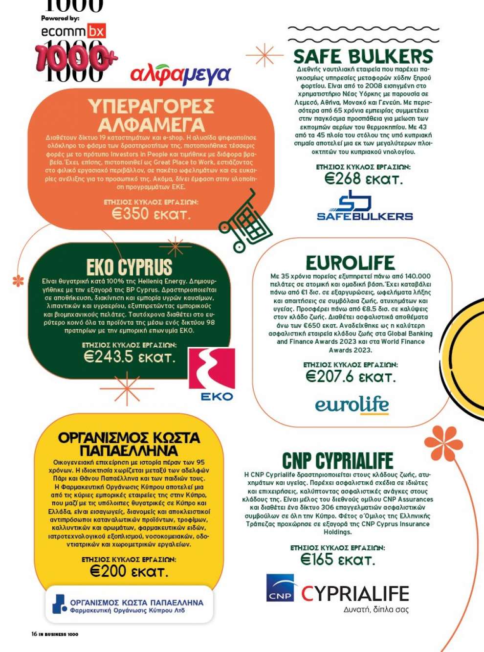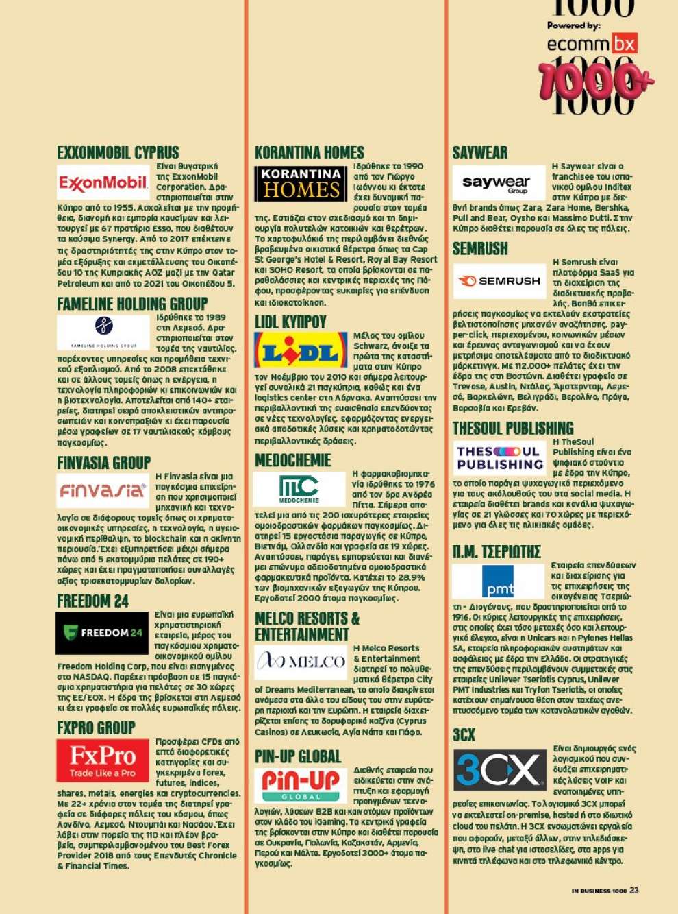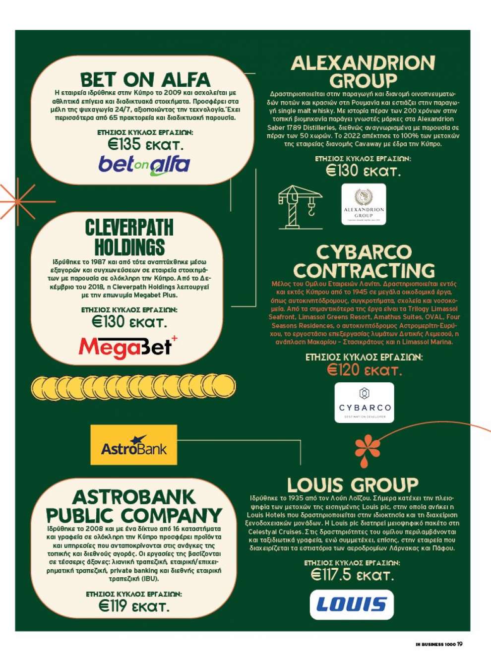 Στο θέμα που ακολουθεί, και το οποίο δημοσιεύεται στη συλλεκτική έκδοση Οκτωβρίου του περιοδικού IN Business με τις 1000+μεγαλύτερες εταιρείες της Κύπρου, περιλαμβάνονται μόνο οι εταιρείες που μας απέστειλαν τα οικονομικά τους δεδομένα ή που υπάρχουν γι’ αυτές διαθέσιμα ενημερωμένα δημόσια στοιχεία.