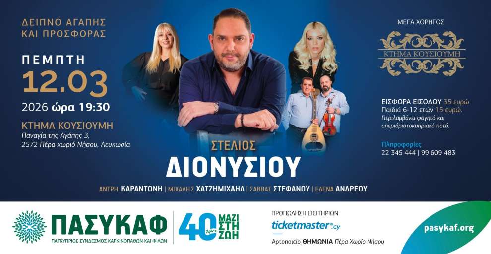 Ο ΠΑΣΥΚΑΦ, σε συνεργασία με το Σωματείο «Ομάδα Εθελοντών Σιάς», σας προσκαλεί σε ένα Δείπνο Αγάπης και Προσφοράς με τον αγαπημένο Στέλιο Διονυσίου. Μαζί του στη σκηνή θα βρίσκονται η Άντρη Καραντώνη, ο Μιχάλης Χατζημιχαήλ, ο Σάββας Στεφάνου και η Έλενα Ανδρέου, για μια βραδιά γεμάτη μουσική, συγκίνηση και χαμόγελα.