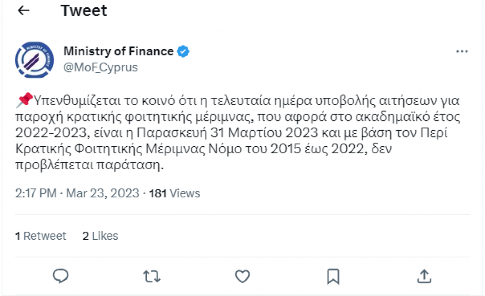Η εν λόγω χορηγία αφορά το ακαδημαϊκό έτος 2022-2023. Όπως υπενθυμίζει το Υπουργείο Οικονομικών με βάση τον Περί Κρατικής Φοιτητικής Μέριμνας Νόμο του 2015 έως 2022, δεν προβλέπεται παράταση.