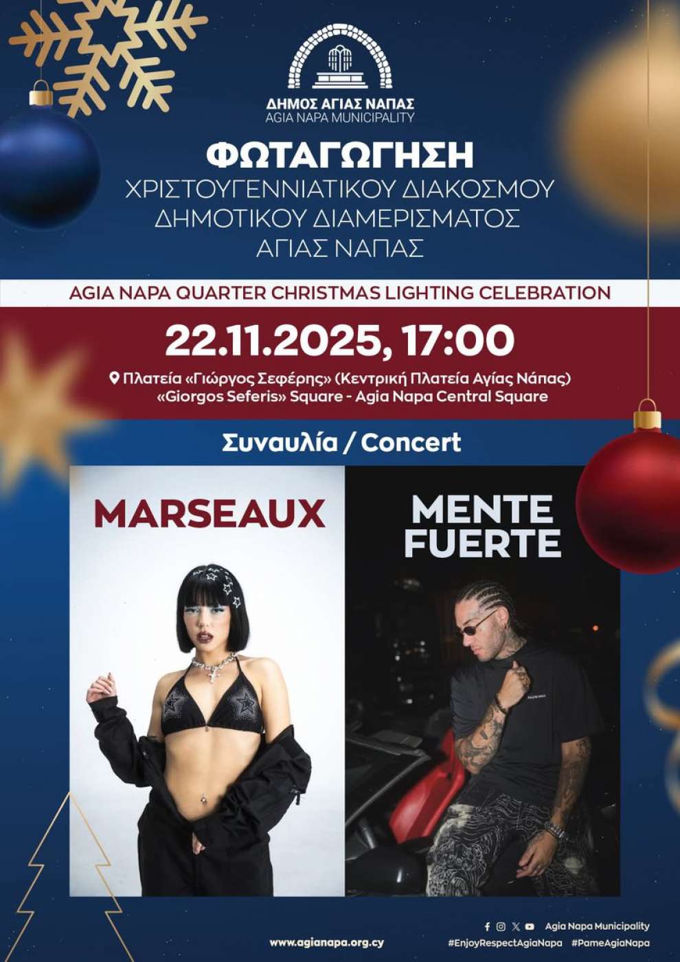 Δύο από τα πιο hot ονόματα της ελληνικής μουσικής σκηνής, Marseaux και Mente Fuerte, έρχονται να απογειώσουν την Κεντρική Πλατεία «Γιώργος Σεφέρης» το Σάββατο 22 Νοεμβρίου 2025, δίνοντας το πιο εκρηκτικό ξεκίνημα στη φετινή χριστουγεννιάτικη περίοδο.