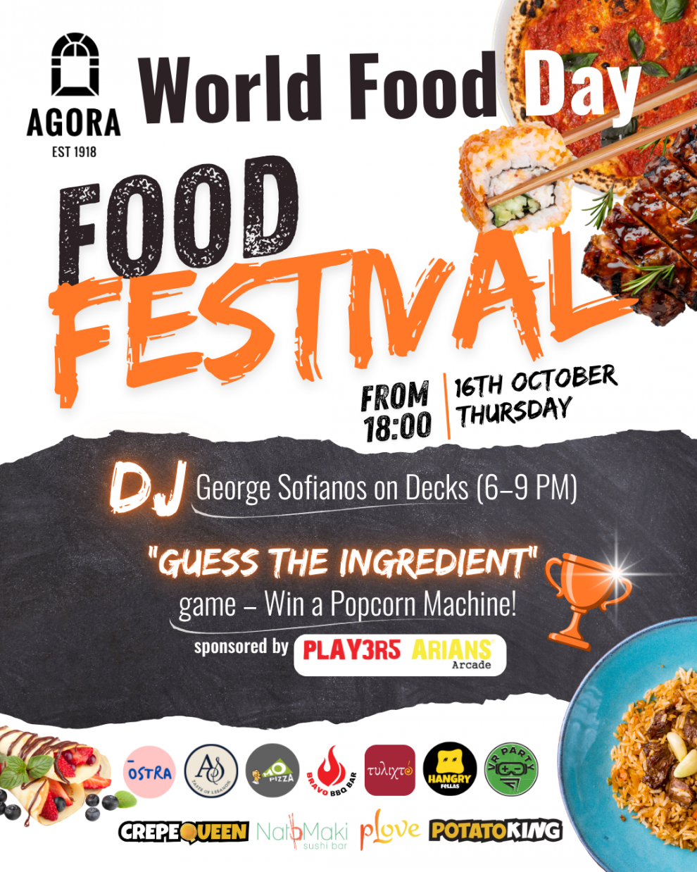 - Στους πάγκους της Agora θα ανακαλύψετε τα πάντα από ζουμερά BBQ ribs και λαχταριστά lobster rolls, μέχρι φρέσκο sushi, πικάντικα tacos και γλυκές κρέπες.
