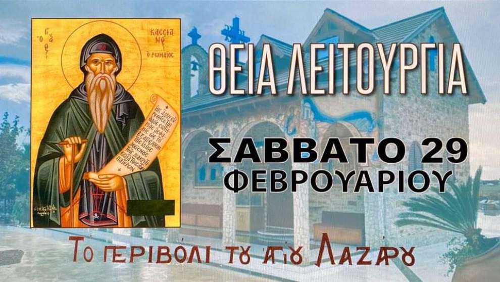 Το Σάββατο 29 Φεβρουαρίου 2020, θα τελεστεί στον Ιερό Ναό “Το περιβόλι του Αγίου Λαζάρου” στη Δρομολαξιά, πρωινή Θεία Λειτουργία του OΣIOY OMOΛOΓHTOY KAΣΣIANOY TOY PΩMAIOY!
