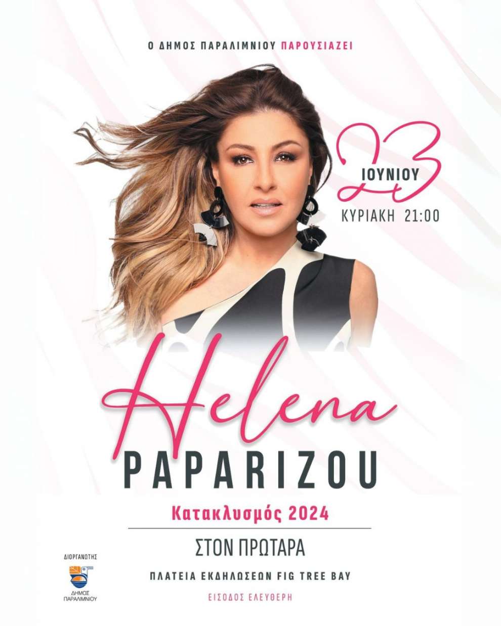 Συγκεκριμένα, την Κυριακή 23 Ιουνίου στις 21:00, στη Δημοτική Πλατεία Κατακλυσμού (Fig Tree Bay) θα δοθεί μεγάλη συναυλία με τη μοναδική σταρ του ελληνικού πενταγράμμου, την Έλενα Παπαρίζου.