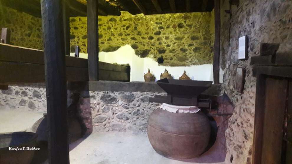 Εισερχόμενος κανείς στο ισόγειο του μουσείου, θα αντικρίσει τον προθάλαμο με τις πάχνες των γαϊδουριών, στις οποίες έτρωγαν, αφού πρώτα είχαν ξεφορτώσει τα κοφίνια με τα σταφύλια.