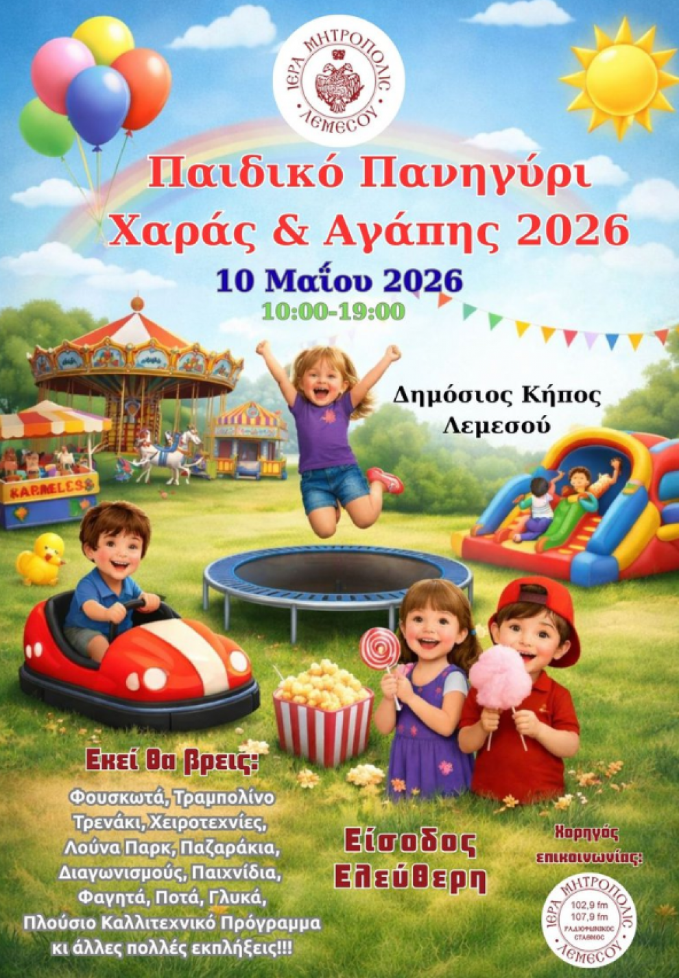 Η μεγάλη αυτή γιορτή, που διοργανώνεται από την Ιερά Μητρόπολη Λεμεσού και έχει πλέον καθιερωθεί ως θεσμός για οικογένειες, θα πραγματοποιηθεί την Κυριακή 10 Μαΐου 2026, από τις 10:00 το πρωί έως τις 19:00 το απόγευμα.