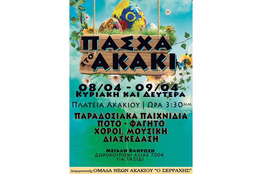 Το χωριό Ακάκι για ακόμη μια χρονιά σας προσκαλεί στην καθιερωμένη του -πια- πασχαλινή εκδήλωση, στην πλατεία του χωριού, για να γεμίσουν με χαμόγελα και στιγμές απέραντης διασκέδασης και παιχνιδιού οι αναστάσιμες μέρες που έρχονται.