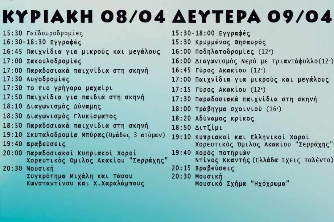 "Ετοιμαστείτε και έρχεται" μας λένε οι διοργανωτές…Την Κυριακή και Δευτέρα του Πάσχα, λοιπόν, στις 8 και 9 Απριλίου αντίστοιχα, η κοινότητα Ακακίου θα μας περιμένει όλους στην πασχαλινή της εκδήλωση στην πλατεία του χωριού, με πολλά παιχνίδια και εκπλήξεις!