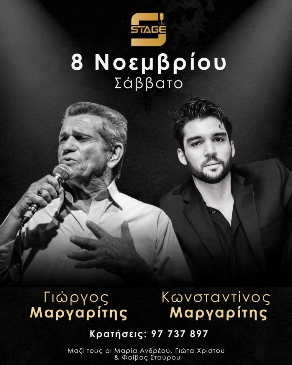 Το Stage Live στη Λευκωσία υποδέχεται το Σάββατο 8 Νοεμβρίου μια μουσική συνάντηση που θα μείνει αξέχαστη! Ο σπουδαίος Γιώργος Μαργαρίτης, μία από τις πιο εμβληματικές φωνές του ελληνικού λαϊκού τραγουδιού, ανεβαίνει στη σκηνή μαζί με τον γιο του, Κωνσταντίνο Μαργαρίτη, για να μοιραστούν μαζί μας μια βραδιά γεμάτη συναίσθημα, ένταση και αγαπημένα τραγούδια.
