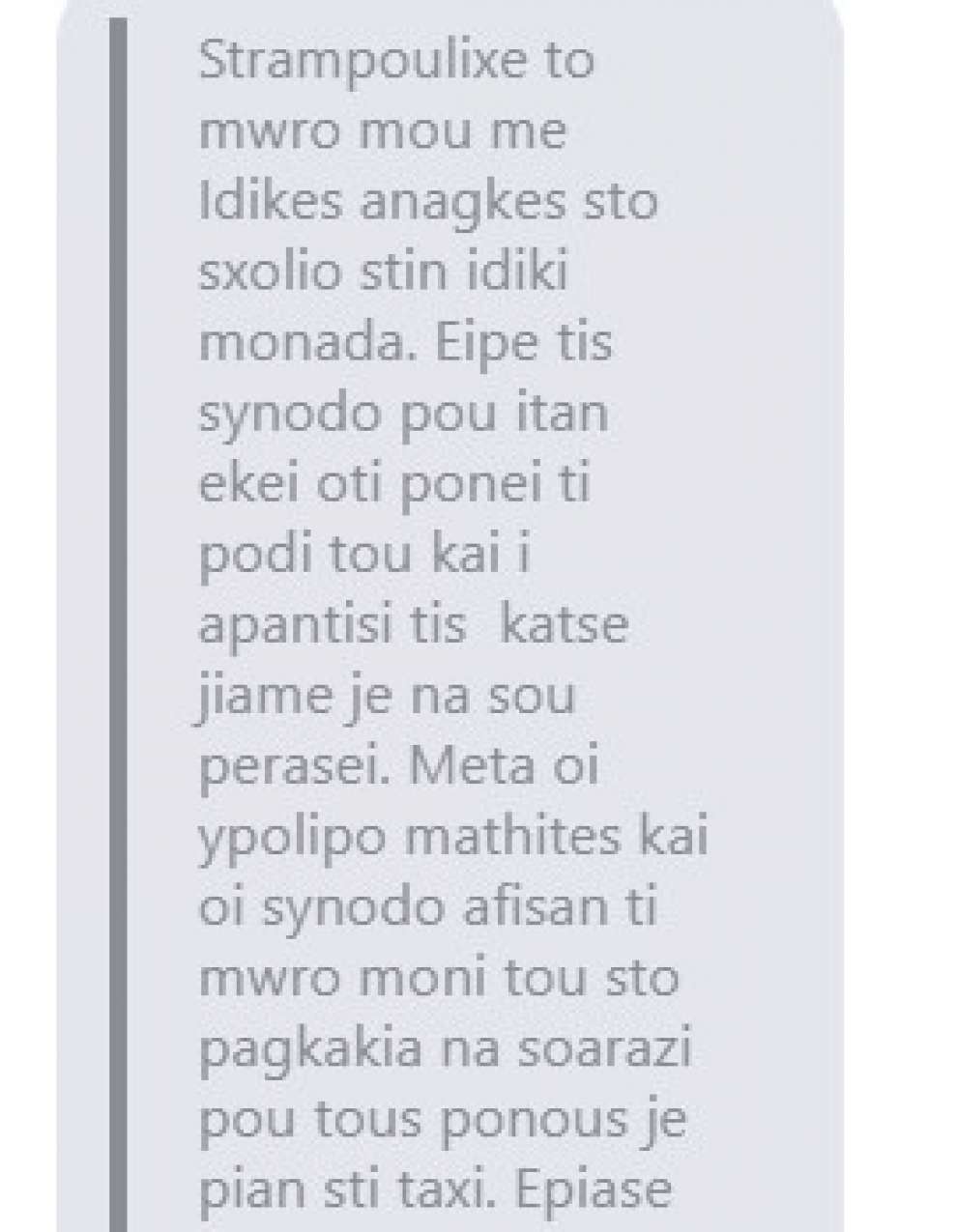 Σύμφωνα με την ίδια, χθες το πρωί, και ενώ οι μαθητές της Γ’ Τεχνικής Σχολής Λευκωσίας, βρίσκονταν στον προαύλιο χώρο του σχολείου, ο γιος της Μ. στραμπούλιξε το πόδι του. Ο ίδιος ενημέρωσε την συνοδό του ότι πονάει η οποία του απάντησε “κάτσε τζαμέ τζιαι εν να σου περάσει”! Έπειτα, αφού το διάλειμμα τελείωσε, η συνοδός μπήκε με τους υπόλοιπους μαθητές μέσα στην τάξη και άφησε τον Μ. πάνω στο παγκάκι, μόνο του στο κρύο, με τραυματισμένο πόδι!