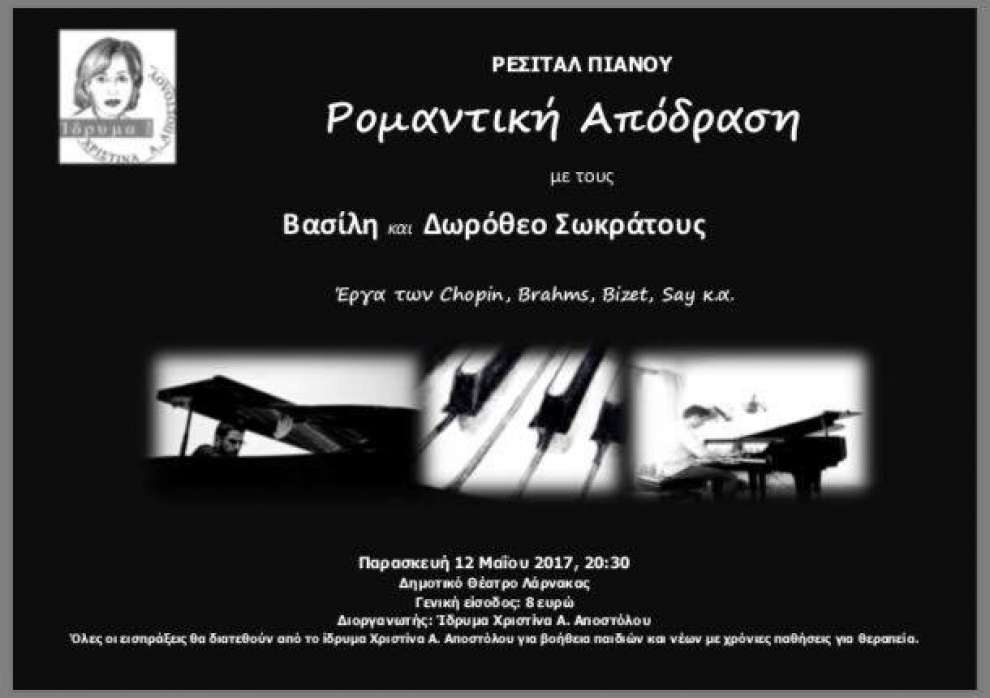 Το ίδρυμα Χριστίνα Α. Αποστόλου διοργανώνει το ρεσιτάλ πιάνου "ρομαντική απόδραση" με τους Βασίλη και Δωρόθεο Σωκρατους, την Παρασκευή 12 Μαΐου και ώρα 20:30 στο Δημοτικό Θέατρο Λάρνακας.