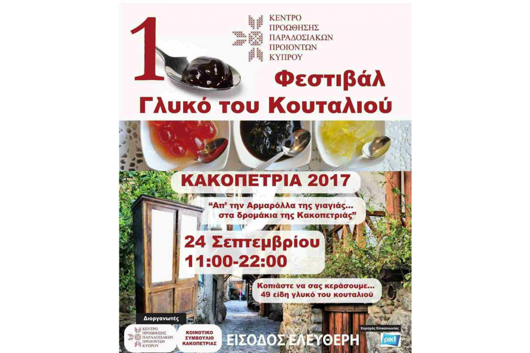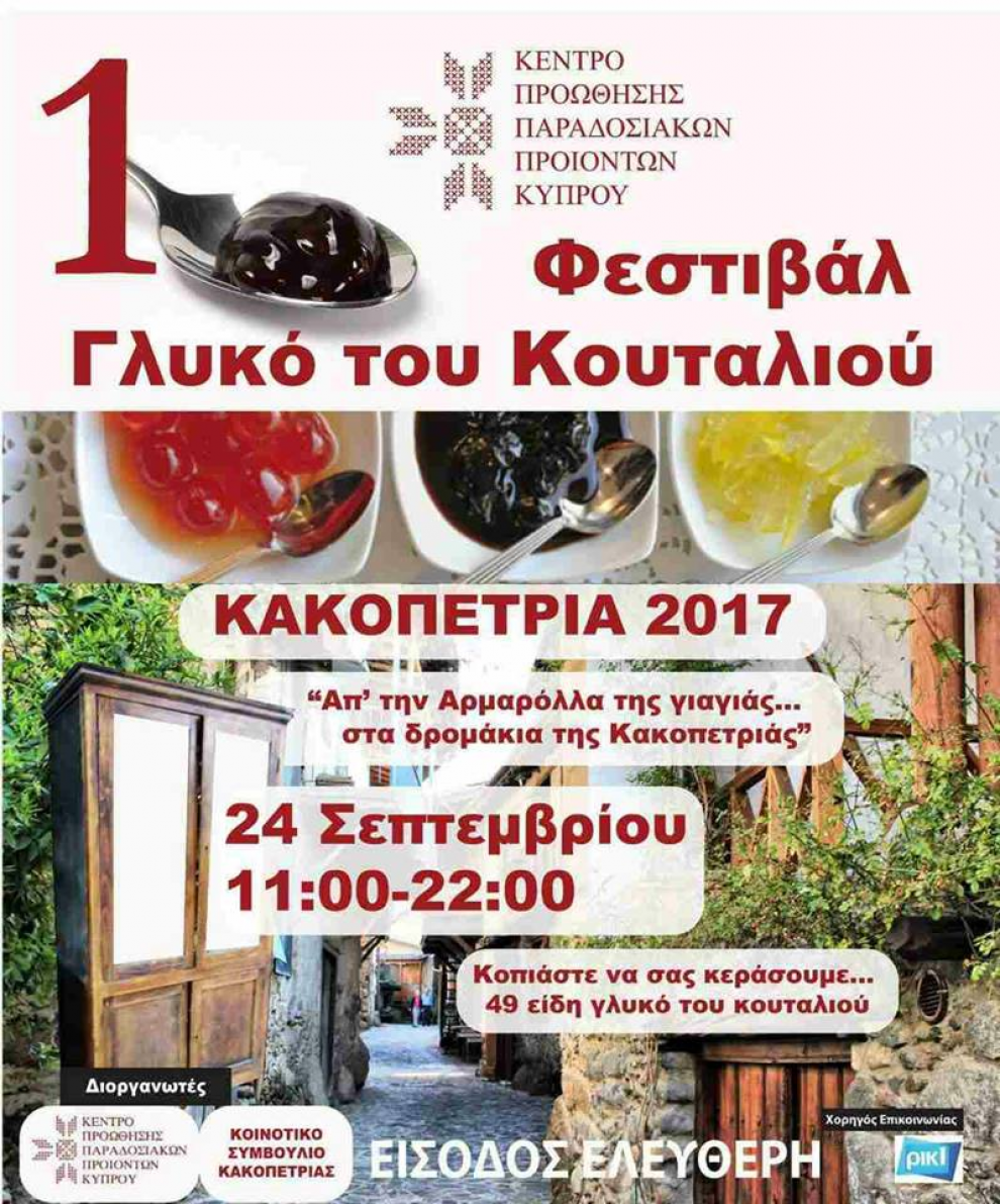Το Κέντρο Προώθησης Παραδοσιακών Προϊόντων Κύπρου σε συνεργασία με το Κοινοτικό Συμβούλιο Κακοπετριάς, διοργανώνει και μας προσκαλεί στο «1ο Φεστιβάλ Γλυκού του Κουταλιού», το οποίο θα πραγματοποιηθεί στις 24 Σεπτεμβρίου 2017, στην Κακοπετριά.