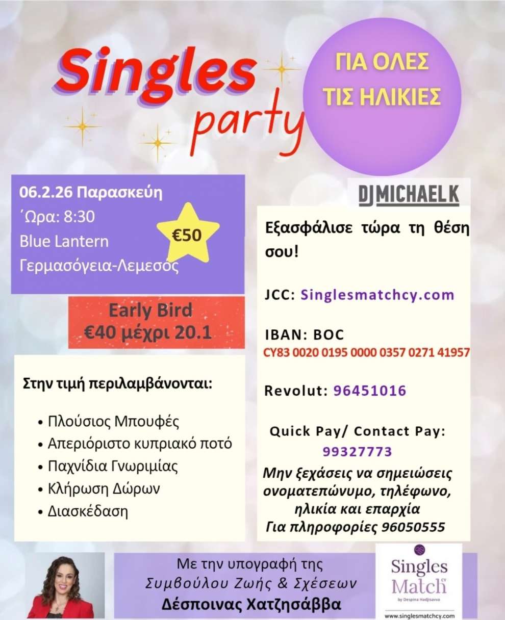Αν είσαι single και αναζητάς κάτι διαφορετικό, κοινωνικό και πραγματικά διασκεδαστικό, τότε αυτό το πάρτυ είναι για σένα. Το Singles Party για όλες τις ηλικίες έρχεται την Παρασκευή 6 Φεβρουαρίου 2026 στο κομψό Blue Lantern στη Γερμασόγεια, για να ενώσει ανθρώπους, χαμόγελα και… νέες γνωριμίες.