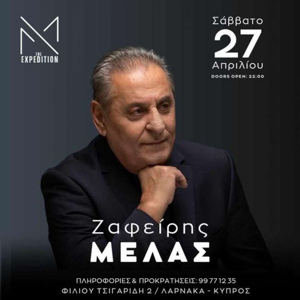 Ο άρχοντας του λαϊκού τραγουδιού ΖΑΦΕΙΡΗΣ ΜΕΛΑΣ με την ιδιαίτερη χροιά και την «γεμάτη» φωνή έρχεται να ταράξει την νυχτερινή διασκέδαση της Λάρνακας, το Σάββατο 27 Απριλίου 2024 στις Moyses The Expedition!