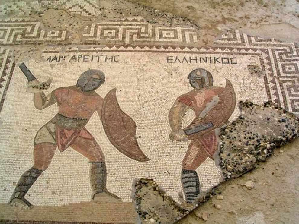 The House of the Gladiators, a Roman house that took its name from the mosaic representations of gladiators that were decorating the central courtyard, dates back to the 3rd century A.D. and is located a few meters east of the "House of Achilles".