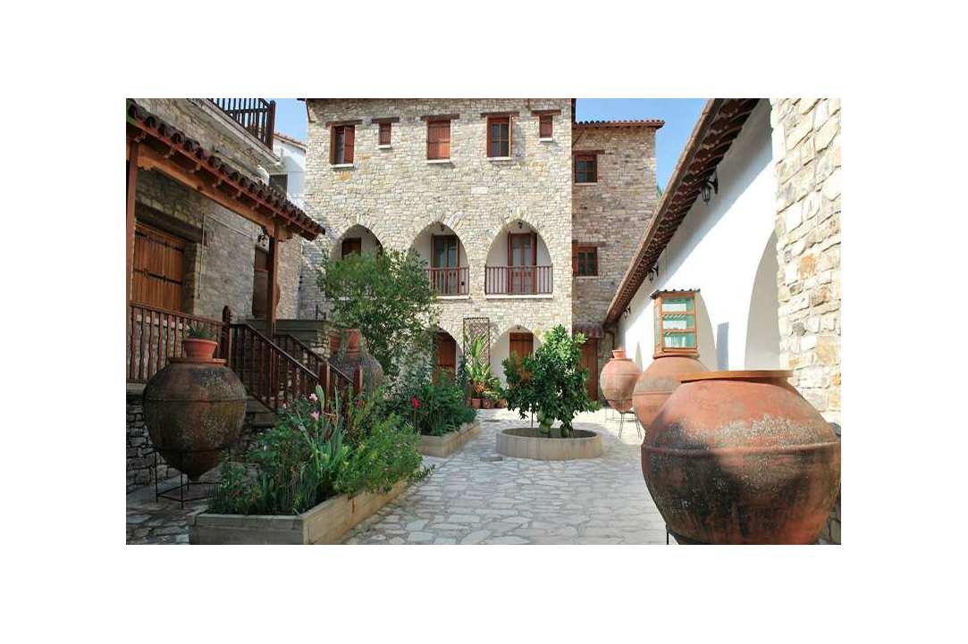 Architecture: Traditional Cypriot monastic architecture with stone details and wooden elements.