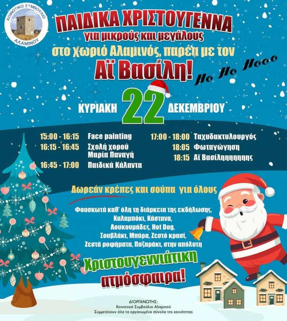 Την Κυριακή 22 Δεκεμβρίου, το χωριό Αλαμινός σας καλεί σε μια μαγευτική γιορτή για μικρούς και μεγάλους, παρέα με τον Αϊ-Βασίλη!