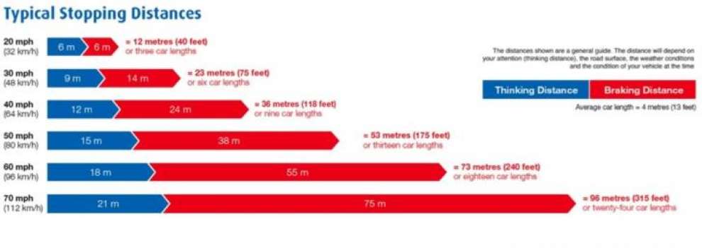 Σύμφωνα με σχετικό σχεδιάγραμμα που ανάρτησε η αστυνομία στα Μέσα Κοινωνικής Δικτύωσης, αναφέρονται οι τυπικές αποστάσεις που διανύει ένα κανονικό αυτοκίνητο για να σταματήσει σε φρενάρισμα.
