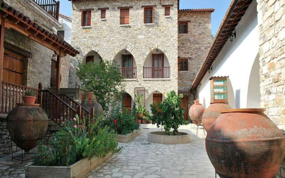 Architecture: Traditional Cypriot monastic architecture with stone details and wooden elements.