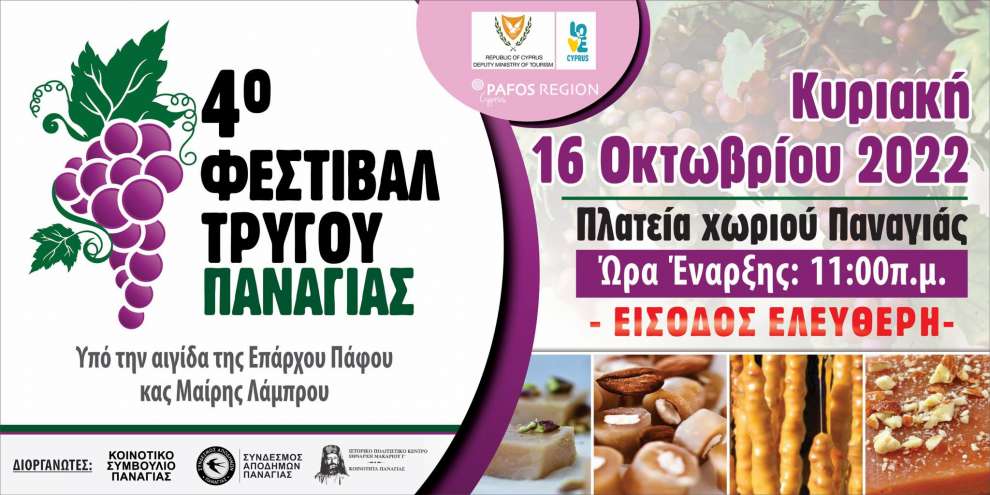 Общественный совет Панагии [Pano Panagia] в обл. Пафосе в сотрудничестве с Ассоциацией экспатриантов Панайи и Культурным центром им. архиепископа Макариоса III организуют 4-й ежегодный Фестиваль урожая винограда и приглашают всех отпраздновать его вместе с ними 16 октября 2022 года.