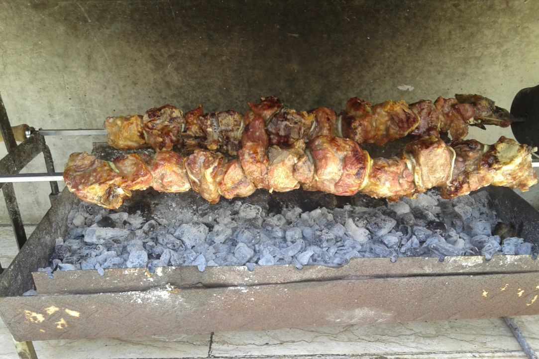 Помещаем вертел над сильным жаром на мангале и готовим в течение примерно 1 часа и 10 минут . Не позволяйте мясу слишком пересохнуть. Непосредственно перед тем как снять вертел, приправляем мясо орегано.
