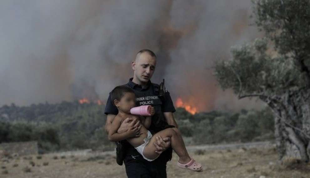 Τον γύρο του διαδικτύου κάνει η συγκλονιστική φωτογραφία από την φωτιά στα Δερβενοχώρια, στην οποία διακρίνεται νεαρός αστυνομικός να μεταφέρει στην αγκαλιά του ένα μικρό παιδί, ενώ πίσω του φαίνονται οι φλόγες από το πύρινο μέτωπο, που συνεχίζει να καίει ανεξέλεγκτα από χτες, Δευτέρα (17/7).
