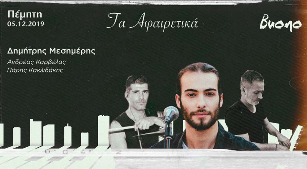Ο Δημήτρης Μεσημέρης, ο Ανδρέας Καρβέλας και ο Πάρης Κακλιδάκης παρουσιάζουν την Πέμπτη, 5 Δεκεμβρίου 2019 στις 9 μ.μ. «Τα Αφαιρετικά» στο Buono Cafe Lounge Bar στη Λευκωσία.